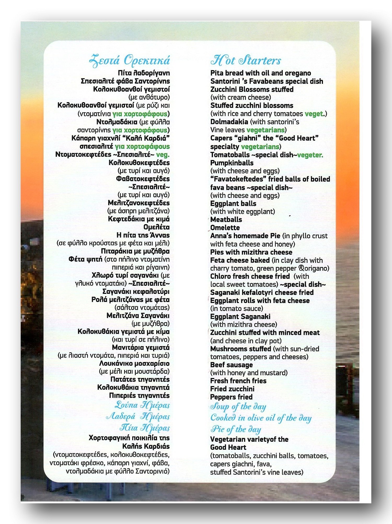 - Vegetarian variety of the Good Heart (tomatoballs, zucchini balls, tomatoes, capers giachni, fava, stuffed Santorini’s vine leaves)